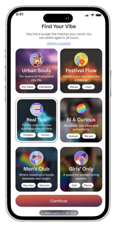Instead of drowning in an ocean of random profiles, you focus on one lounge at a time. Fewer matches, better conversations, higher success rates. It’s dating with intention, not addiction.