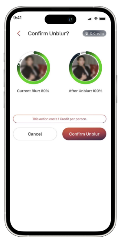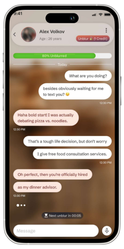 Your actual photos are encrypted and only unblur through real conversation. No screenshots, no saves, no sharing. When conversation ends, so does photo access.