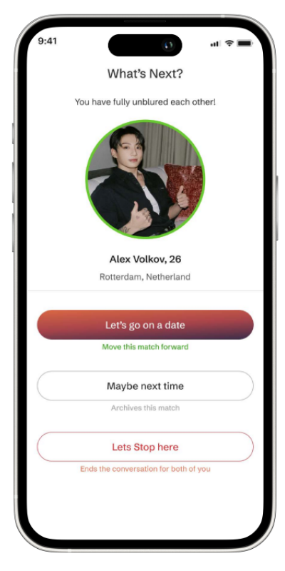 This happens sometimes, and that’s completely normal and expected. The key difference is that by the time photos are revealed, you’ve already invested in getting to know someone’s personality. Our beta data shows that 73% of users who initially felt lukewarm about a revealed photo continued the conversation and 41% eventually met in person – compared to virtually 0% on traditional apps where physical attraction determines the initial match. The emotional investment changes how you perceive physical compatibility.